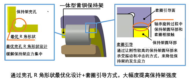 由于運(yùn)行中需要承受來(lái)自軌道的振動(dòng)和沖擊作用,鐵道車輛齒輪箱用軸承的保持架強(qiáng)度顯得尤為重要。SIAIF 基于自身在鐵道車輛齒輪箱用圓錐滾子軸承的技術(shù)積累和大量業(yè)績(jī),為本次的新產(chǎn)品開發(fā)了新型的高強(qiáng)度保持架。新的設(shè)計(jì)通過(guò)兜孔形狀的優(yōu)化以及引導(dǎo)方式的調(diào)整,能夠使保持架的發(fā)生應(yīng)力降低 75%。